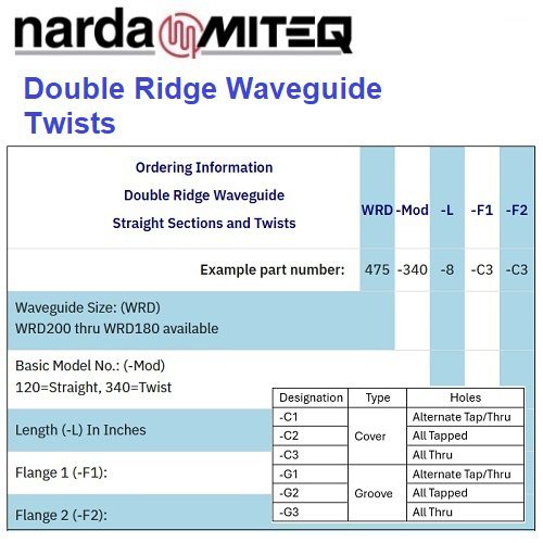 Narda-MITEQ 生產各種直型扭轉90°波導管組件,涵蓋雙脊矩形波導的全頻率範圍,並提供多種法蘭配置。
