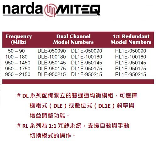 DL 系列配備獨立的雙通道均衡模組,可選擇機電式 (DLE) 或數位式 (DL1E) 斜率與增益調整功能。